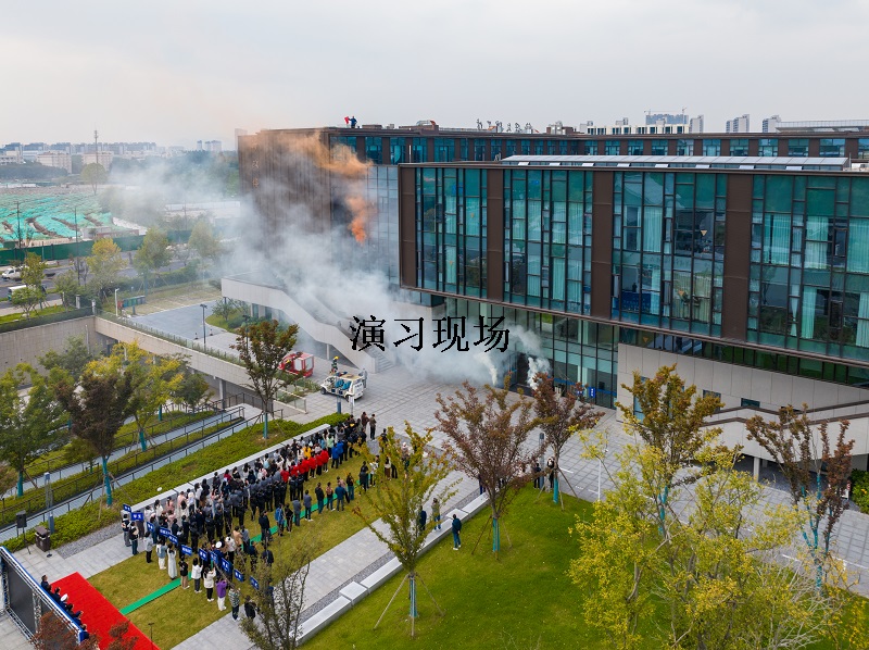 演习模拟了行政楼出现火情,启动一键报警装置报警,人员疏散,消防人员进行灭火和伤员救治的全过程。