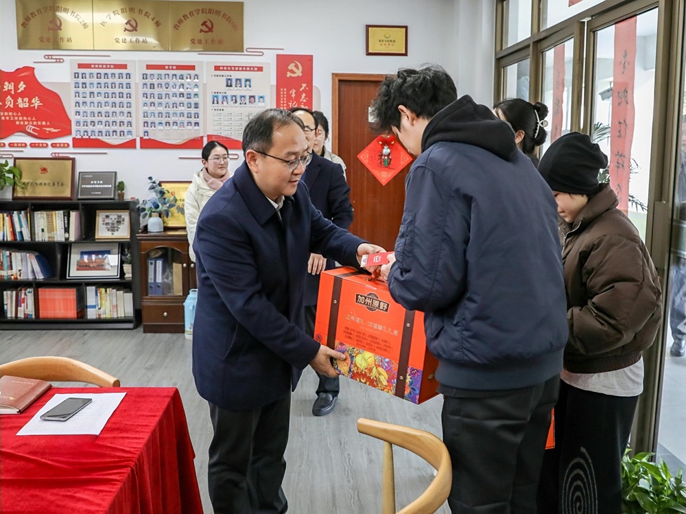 在阳明书院,赵阳与来自四川泸州、湖南岳阳、浙江温州等地的同学共贺新春快乐,畅谈新年愿景。他仔细询问了同学们留校期间的学习计划和生活保障情况,叮嘱大家注意安全,保持良好作息和健康生活。同时也要求相关部门做好餐饮服务和后勤保障工作,让留校学生过一个欢乐、祥和、安全的春节。