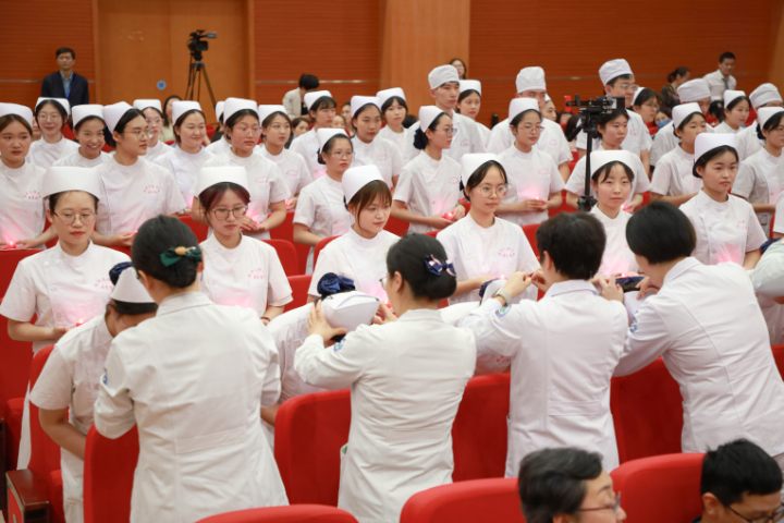 在授帽仪式上,最美护士代表滕斯斯、裘万民为学生点燃象征着南丁格尔精神的红色蜡烛,并依次传灯,点亮了现场所有护生手中的蜡烛;5位护理前辈和十佳护士长为现场所有学生代表授帽,氛围格外庄严而神圣。