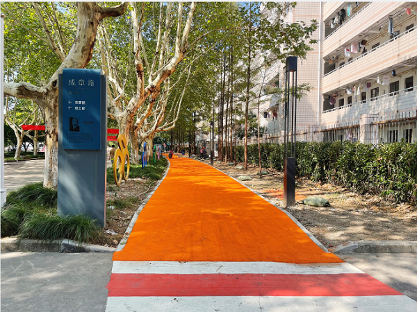 校园健步道建设。根据学校文化校园建设方案,对学校原有的绿化区域进行改造,将其转变成一条功能丰富的健步道,健步道总长约2100米,分塑胶和划线,采用绿、黄双色线,路口设置彩色人行道。健步道不仅实现了人车分流,确保师生出行安全,更成为师生健身休闲的好去处。