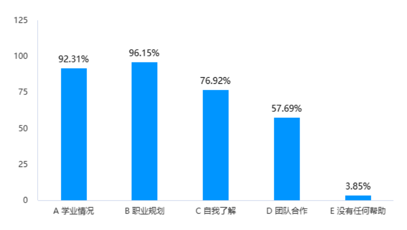 研学活动结束后,我们对同学们就活动成效进行了在线问卷调查。根据调查结果,学生对本次研学活动的满意率达到100%,其中非常满意达73%以上(图5a)。本次研学活动给学生在学业情况、职业规划、自我了解和团队合作方面都带来了提升,其中感觉对学业情况和职业规划有利的同学都达到了90%以上(图5b)。100%的同学认为对未来的学业和就业规划有了更清晰的认识(图5c)。在学生对本次活动的体会中,学习、专业、复合型、职业、英语、见识等正向词语成为了高频词汇,体现了研学活动对他们的促进和启发作用(图5d),为同学们今后的专业学习和职业规划指明了方向。