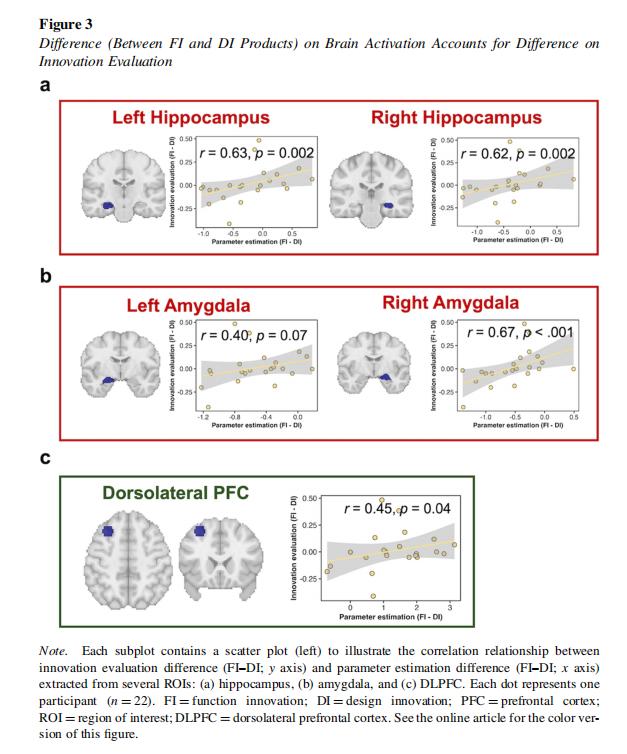 该研究以在校大学生/研究生为研究对象,采用功能磁共振成像(fMRI)技术,考察了个体对三类产品(功能创新产品/FI、外观创新产品/DI、普通产品/OP)进行创新性评估的神经机制。研究发现,在行为层面,功能创新(FI)产品的反应时显著长于设计创新(DI)产品,这表明FI需要更多认知资源;神经影像学分析显示,DI在海马体和杏仁核中引发了更强的血氧水平依赖信号,这与情绪唤醒和新奇性处理有关;而FI激活了背外侧前额叶皮层(DLPFC),这与概念扩展相关。研究发现设计创新更可能通过快速、自主的过程进行处理,而功能创新更依赖于概念驱动的推理,这些区域血氧水平依赖信号可预测主观创新性评价。