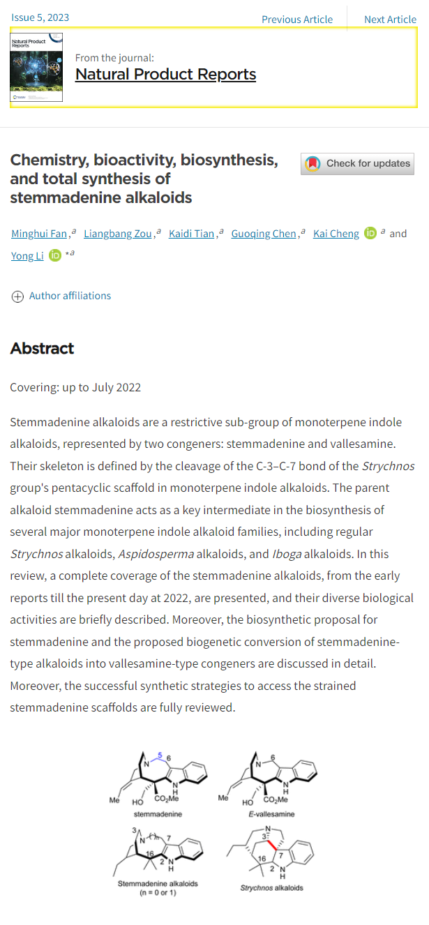 化学化工学院浙江省精细化学品传统工艺替代技术研究实验室团队在药物化学领域顶级期刊《Natural Product Reports》发表论文